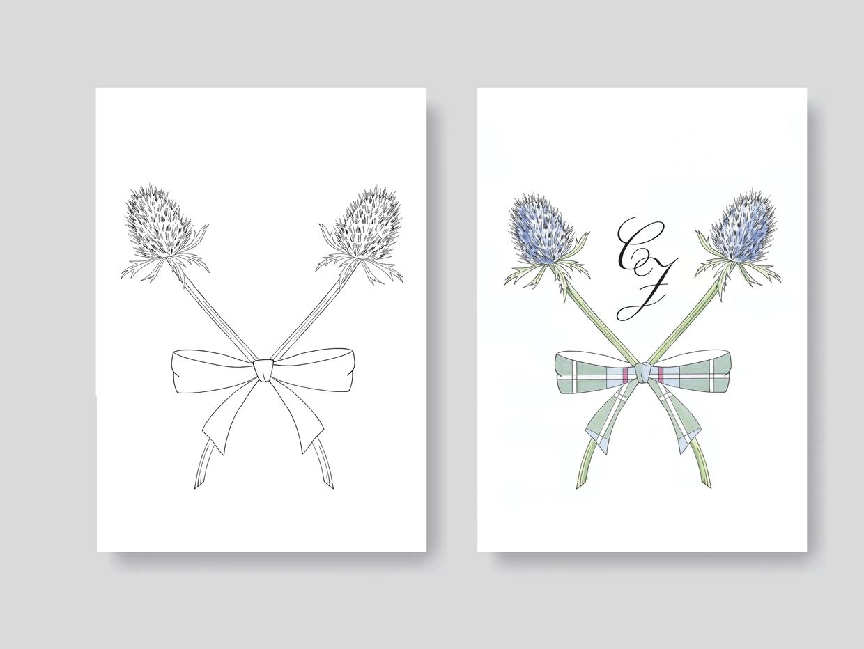 This custom wedding logo and invitation were designed to transport you to the beautiful Scottish countryside. The wedding logo Incorporates the brides bouquet with a spotlight on Sea Hollies and the grooms Scottish family tartan.